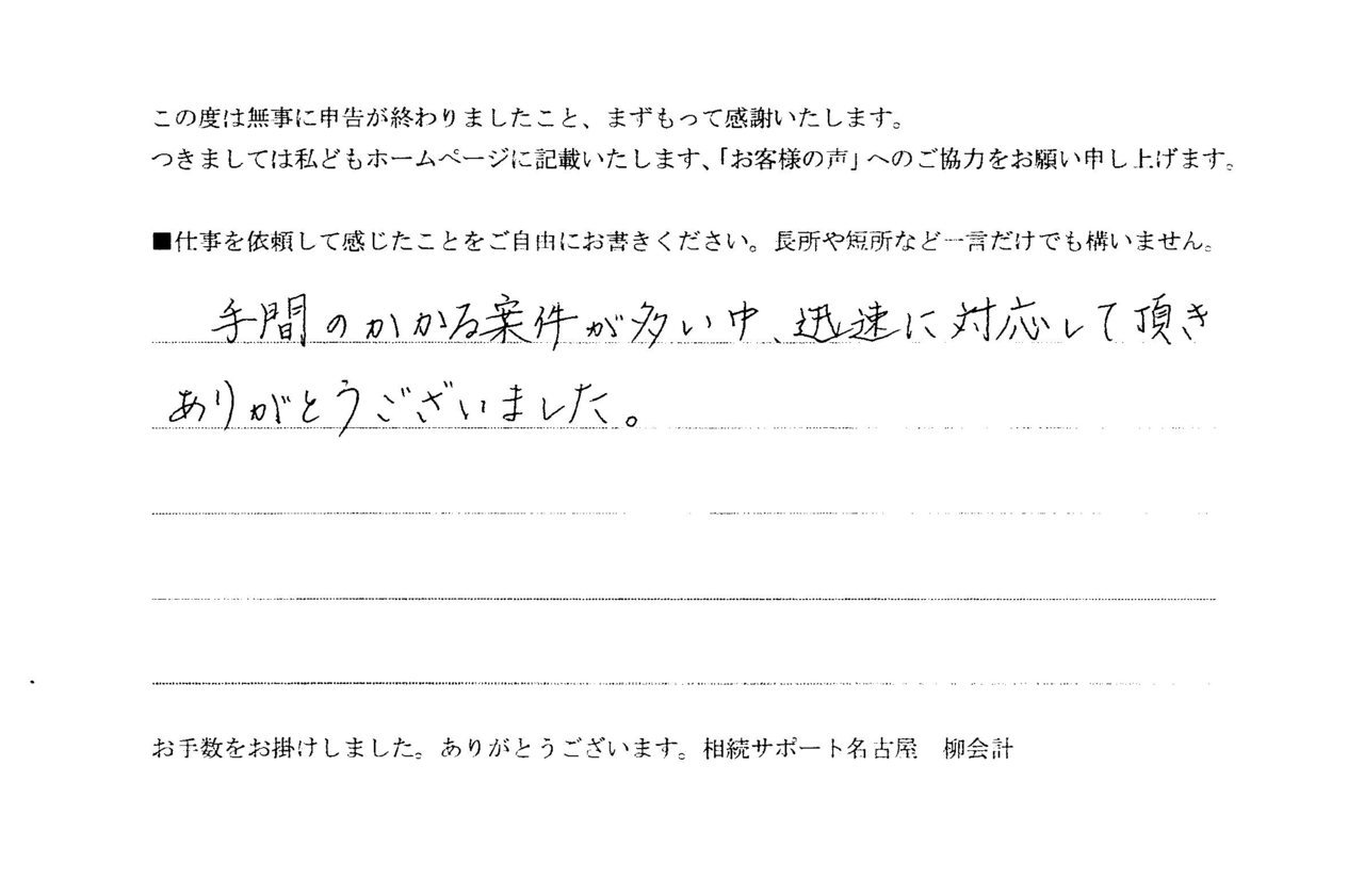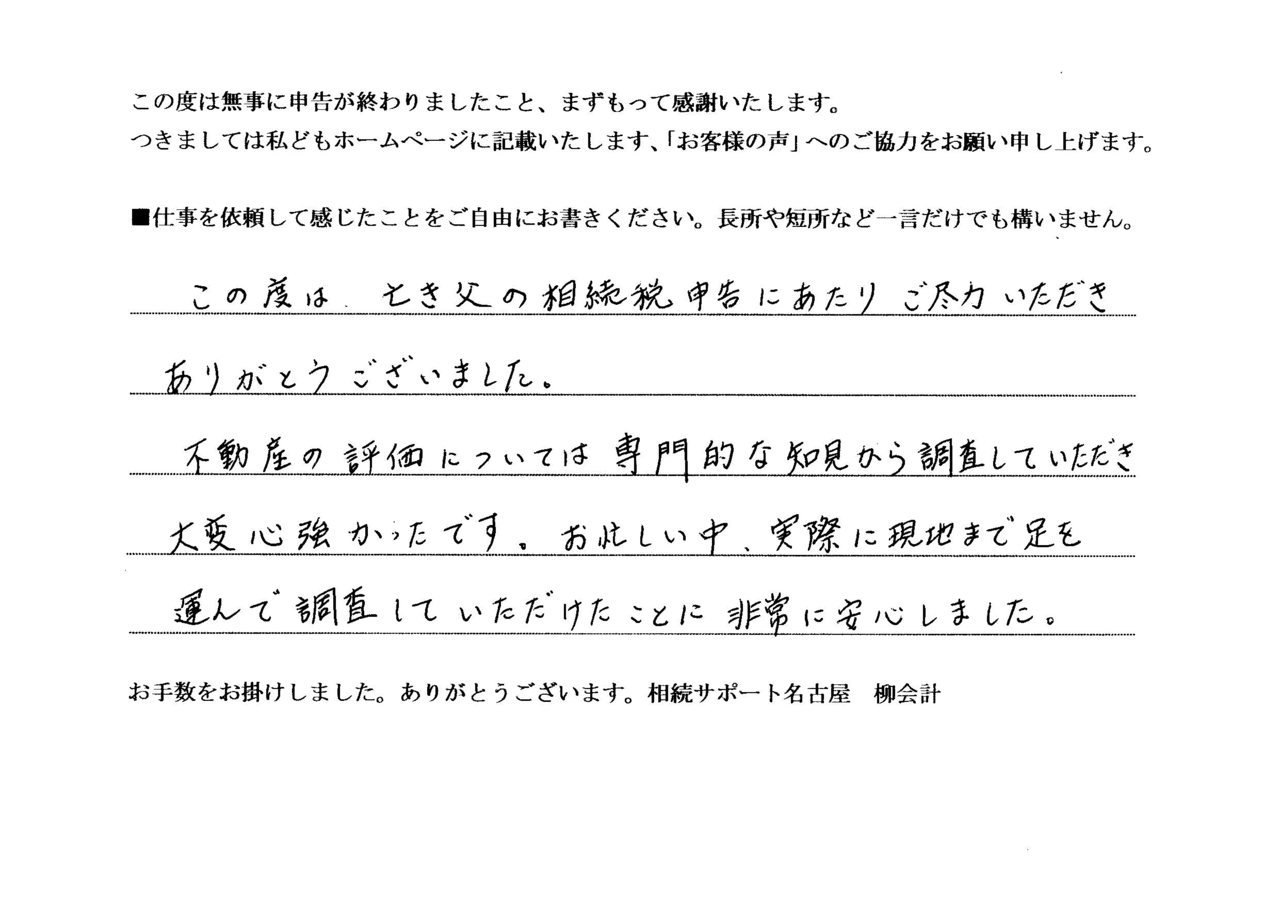 この度は無事、相続税申告が終わりましたこと、先ずもって感謝いたします。お客様から仕事を依頼しての感想が届きました。「お客様の声」に追加いたしました。ご意見ありがとうございます。